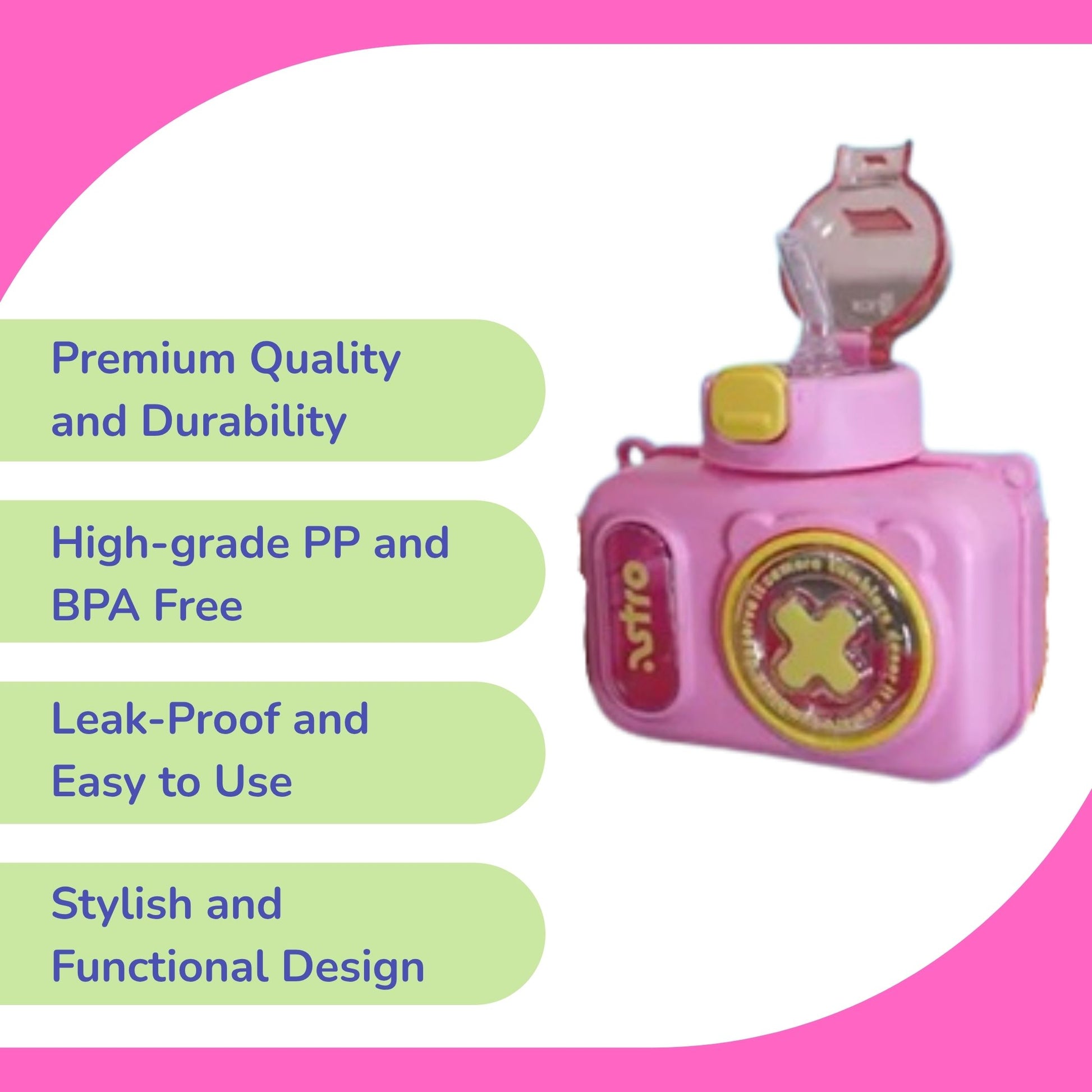 Sipper Portable Water Bottle, Camera Shaped | Popup Button | Removable Strap Cute and Functional Water Bottle, 600ml (Pink)